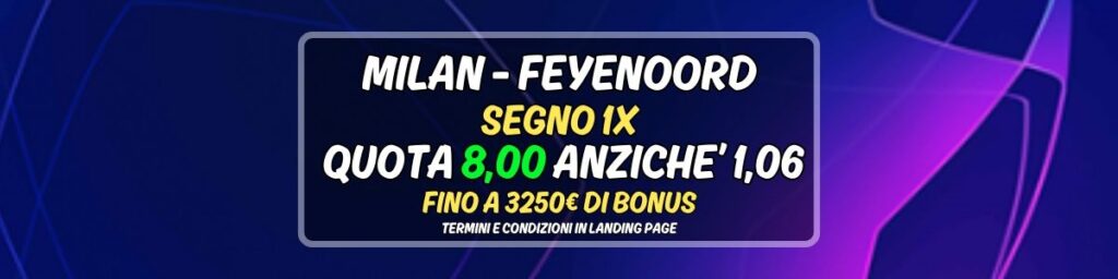I BOOKMAKERS quotano la vittoria del Milan a 1,36 contro la vittoria del Feyenoord quotata a 7,50 molto indicativo anche il segno X quotato a 5,25 ma anche la DOPPIA CHANCE +OVER 1,5 quotata a 1,26 e la COMBO 1+OVER 1,5 quotata a 1,50