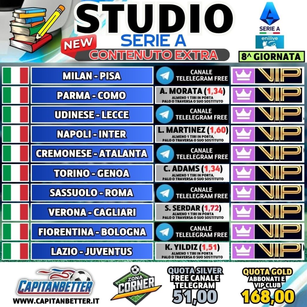 - QUOTA GOLD consultabile per utenti del VIP CLUB o ABBONATI al CANALE INSTAGRAM O ABBONATI FACEBOOK