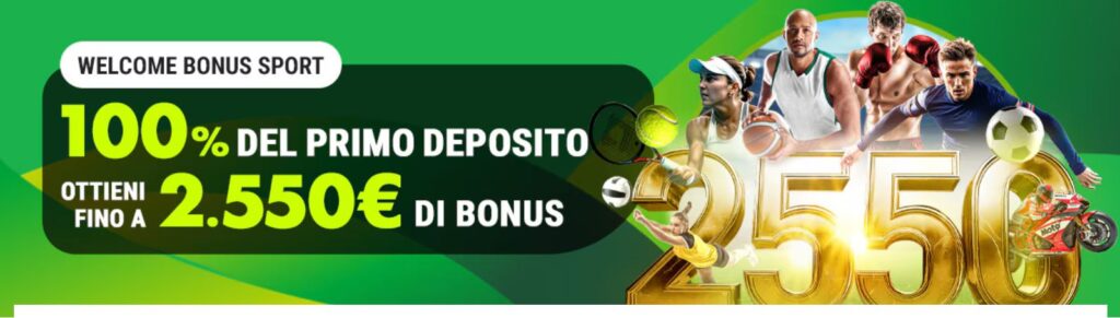 – Registrati, esegui un primo deposito di minimo 20€ entro 7 giorni e ricevi fino a 2550€ di Bonus Sport così suddiviso:
