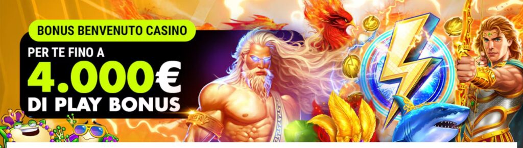 - Il Play Bonus sarà pari all’importo del primo deposito fino ad un massimo di 2.000€; Per sbloccare il Play Bonus sarà necessario giocare un importo pari a 40 volte il valore del Play Bonus ottenuto;