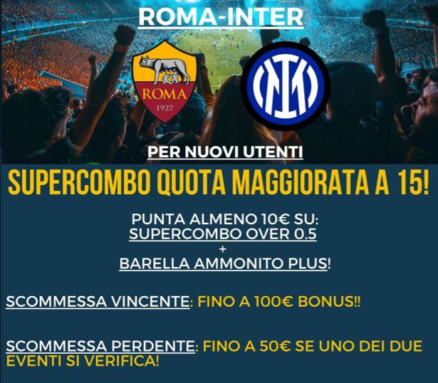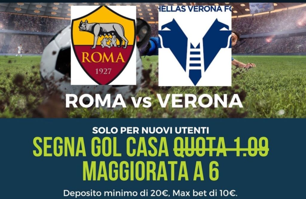 Registrati tramite il banner, convalida il conto invando un documento, deposita almeno 20€ e scommetti subito 10€ sul segno OVER 0,5 CASA (ROMA SEGNA GOL) e se la squadra di casa segnerà almeno 1 gol nel match, entro 72 ore avrai accredita sul conto gioco la quota maggiorata a 6,00.